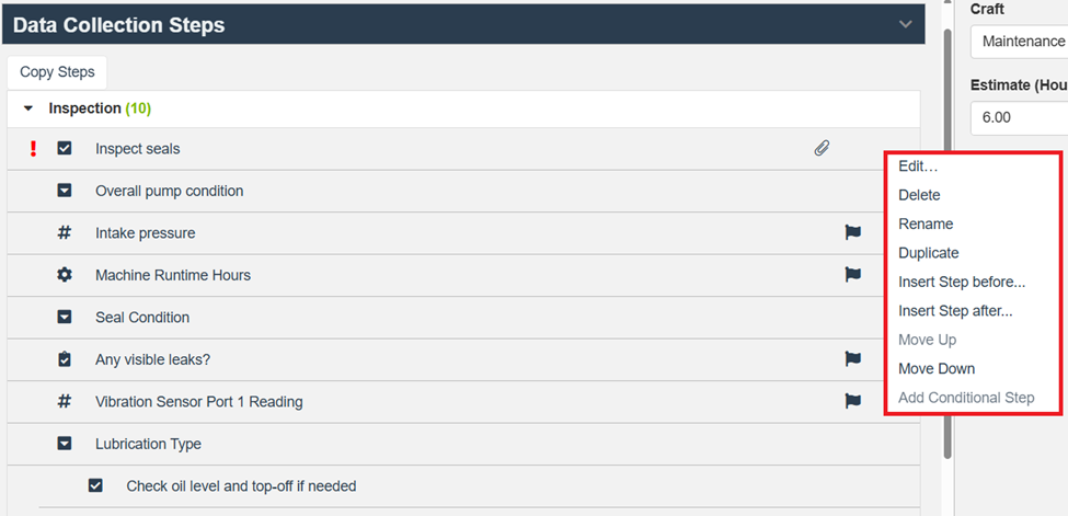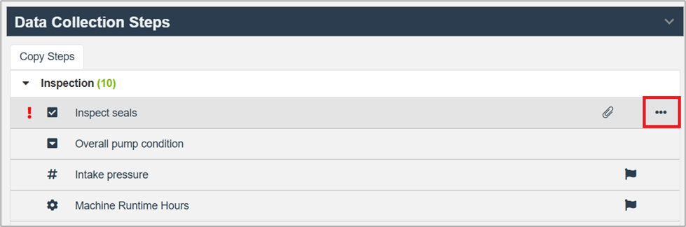 数据采集(也称为状态评估)步骤用于在任务执行过程中收集结构化信息。这些步骤可以出现在 LLumin CMMS+ 的多个区域。这些步骤会引导用户完成检查、测量、确认以及其他所需输入,以确保数据采集的一致性和准确性。